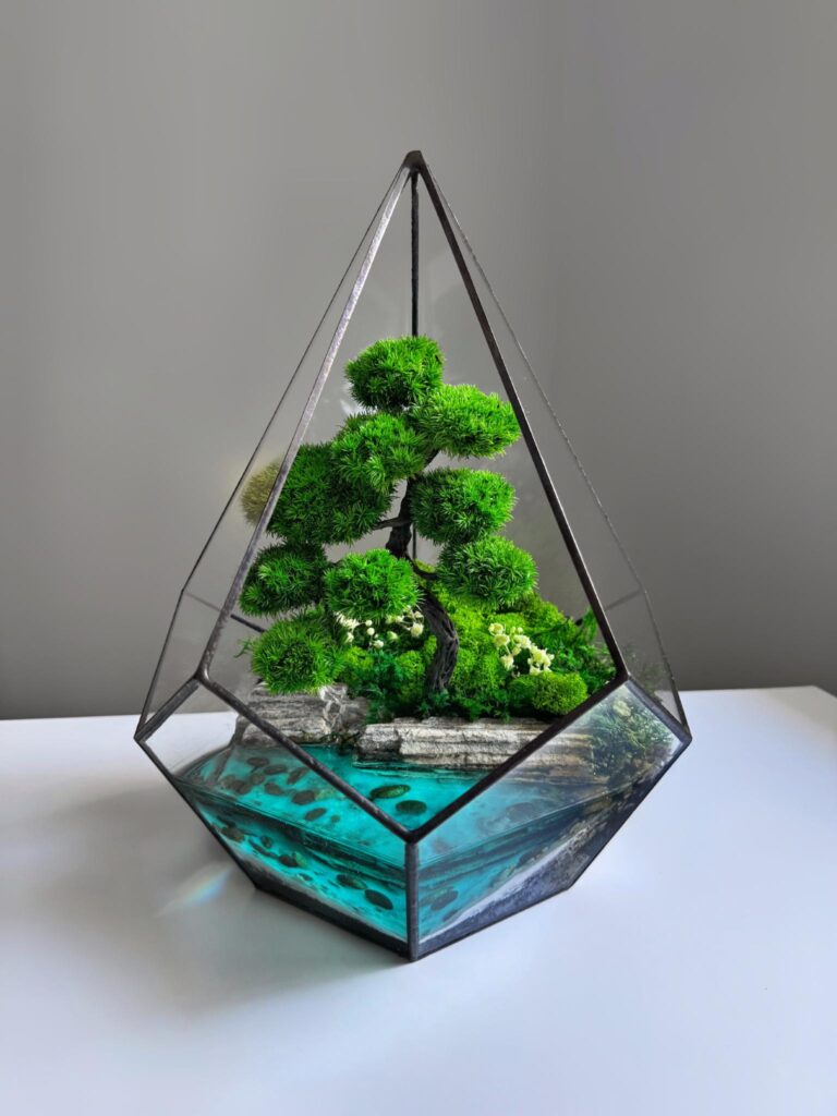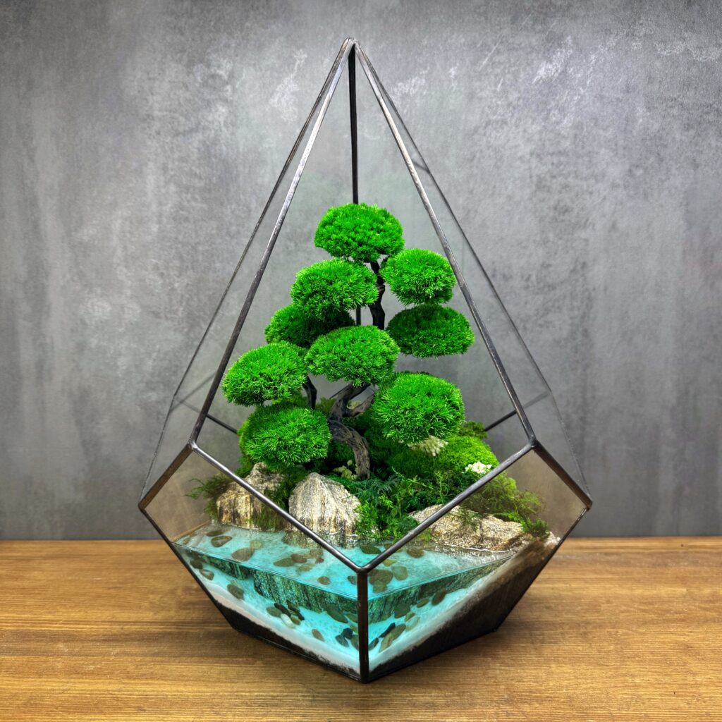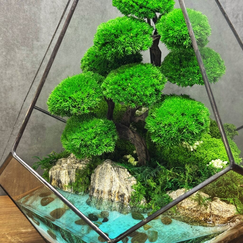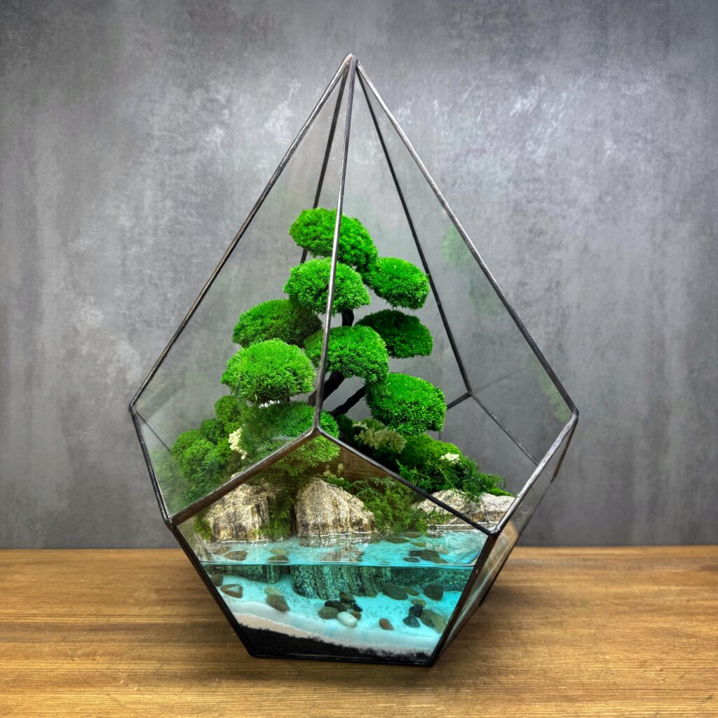 Мосаріум – це флораріум, виготовлений зі стабілізованих рослин. Такий мосаріум не вимагає жодного догляду, поливу і не потребує сонячного світла.