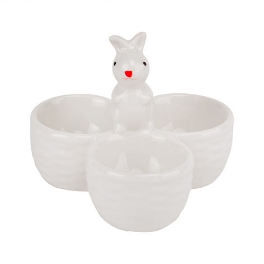 Ця вишукана підставка для 3 яєць виготовлена з якісної білої кераміки з глянцевим покриттям. У центрі композиції — фігурка милого кролика з червоним носиком, що створює святковий настрій. Підставка має три глибокі осередки з текстурною поверхнею, які ідеально підходять для сервірування крашанок, шоколадних яєць або невеликих десертів. Виріб стійкий, легко миється та стане стильним елементом декору у святкові дні.
