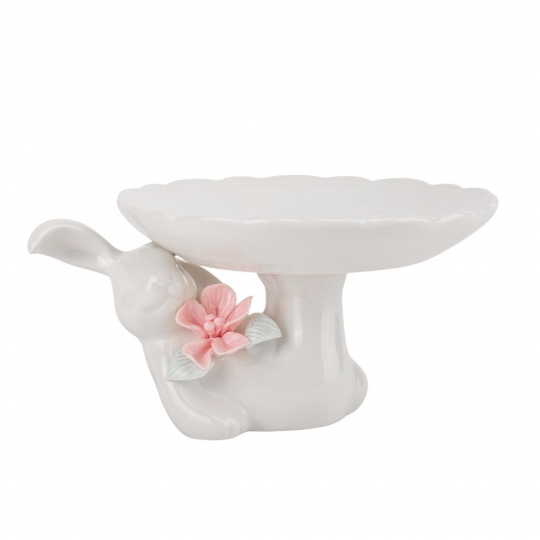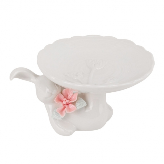 Ця вишукана керамічна підставка виконана у вигляді білого кролика, який підтримує білу платформу з витонченими хвилястими краями. Рельєфний квітковий декор надає підставці елегантності та робить її чудовим акцентом для сервірування. Вона ідеально підходить для подачі святкових ласощів, випічки, шоколадних яєць або інших солодощів. Її ніжний дизайн створить атмосферу затишку та весняного настрою.