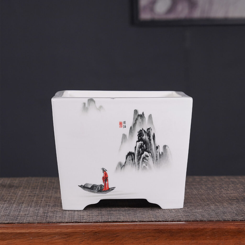 Горшок для бонсай «Горы Фудзи» — это воплощение восточной философии в изысканной форме. Белоснежная керамика украшена тонкой живописью с горным пейзажем и фигурой в кимоно. Такой аксессуар не только украсит ваш интерьер, но и станет настоящим произведением искусства.