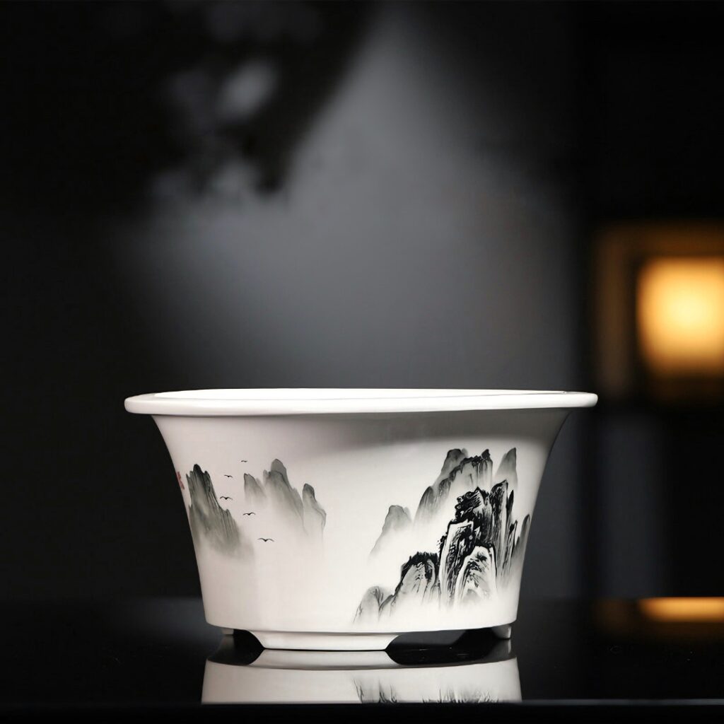 Эстетика японской живописи, воплощённая в фарфоре. Белая бонсайница с нарисованным горным пейзажем создаёт атмосферу спокойствия, вдохновлённую природой. Широкая форма идеальна для композиций с несколькими растениями или деревом с раскидистой кроной.