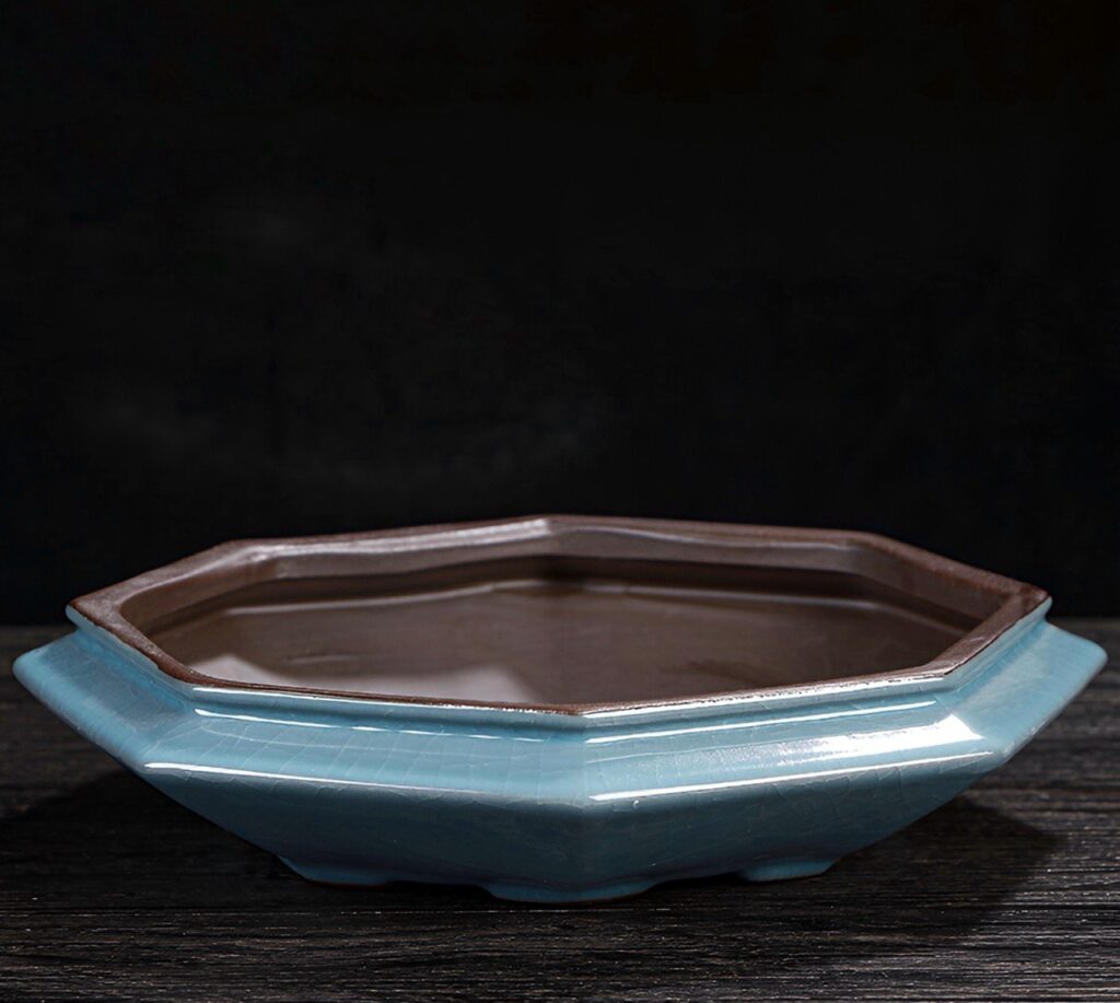 Горшок для бонсай сочетает элегантность восточной эстетики и удобство для выращивания миниатюрных деревьев. Восьмигранная форма делает его эстетическим и гармоничным элементом интерьера, а глазурованное покрытие нежно-голубого оттенка придает утонченность. Низкие бортики обеспечивают комфортное развитие корневой системы бонсай, а прочная керамика гарантирует долговечность.