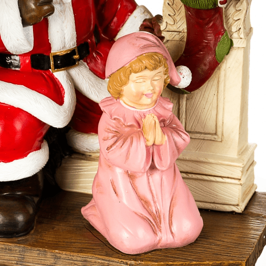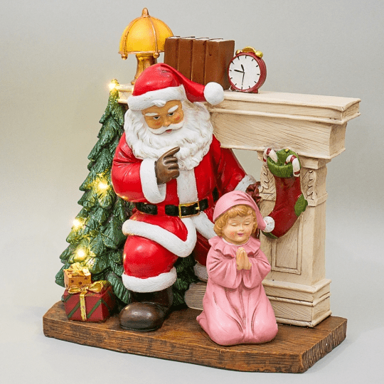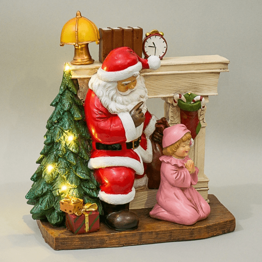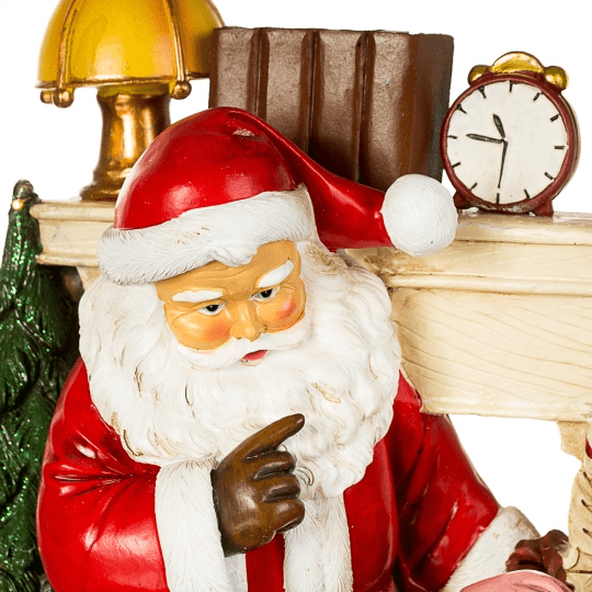 Новогодняя статуэтка «Ожидая Санты» изображает волшебный эпизод, во время которого ребенок ждет чуда и прихода Санты или Деда Мороза. Фигурка окрашена в яркие цвета и светится огнями, создавая праздничное настроение и магию новогодней ночи. Фигурка изготовлена из прочного искусственного материала и выглядит достаточно реалистично.