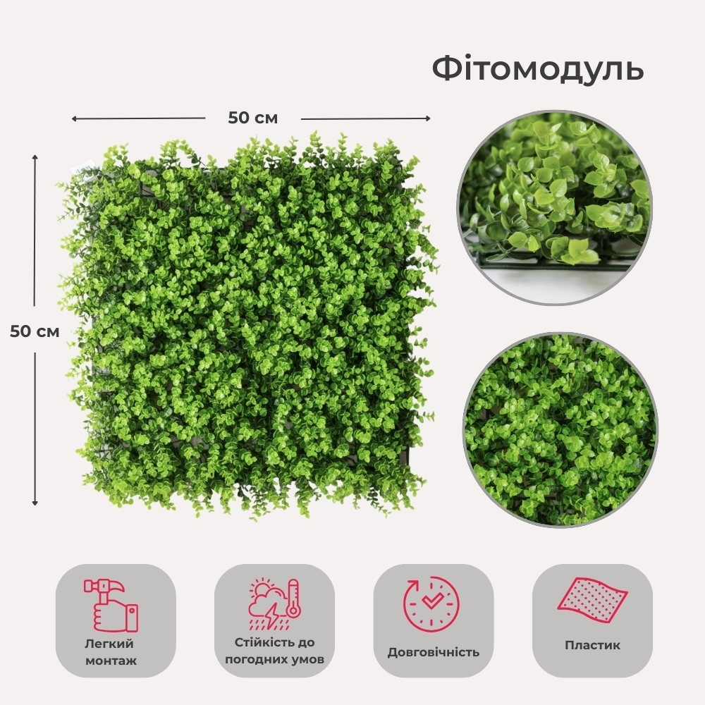 Фитомодуль 50×50 см – декоративная панель из искусственной зелени для вертикального озеленения интерьеров и фасадов. Легкий монтаж, устойчивость к погодным условиям и долговечность делают его безупречным идеальным решением для стильного зеленого пространства.