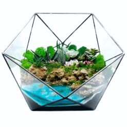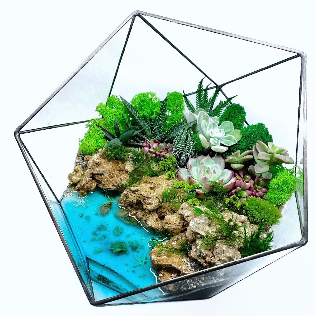 Флорариум с редкими суккулентами и имитацией светящегося в темноте водоема.