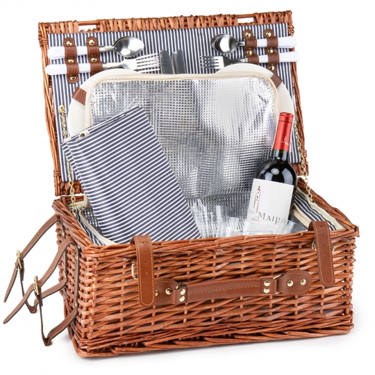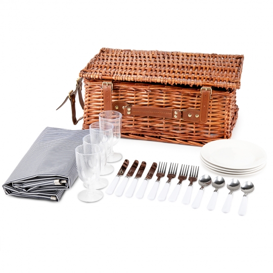 Эта замечательная корзина — идеальный вариант для пикника с семьей или друзьями, атмосферной фотосессии. Корзина достаточно просторная и содержит 4 набора посуды. Вы также можете легко разместить внутри необходимую еду и напитки. Корзина для пикника не только красивая и украсит Ваш праздник, но и экологичная, безопасная для окружающей среды