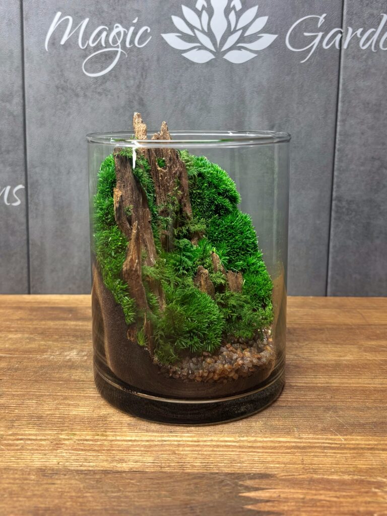- Материалы: стеклянная форма, натуральное дерево, натуральные камни, мох стабилизированный и другие стабилизированные растения