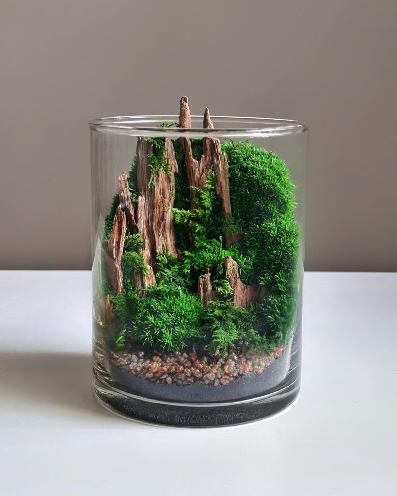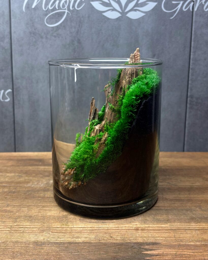 Элегантный флорариум в цилиндрической стеклянной колбе – это утонченная интерьерная композиция, вдохновленная природными горными пейзажами. Внутри – насыщенный зеленый мох, декоративные каменные элементы и природная текстура древесины, формирующие эффект миниатюрных скал среди густой растительности. Нижний слой из натуральных камней придает композиции глубины и завершенности.