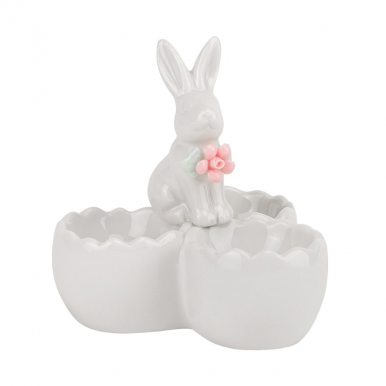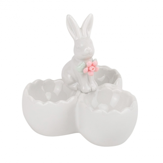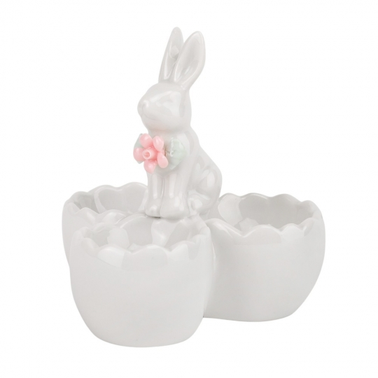 Эта изысканная подставка для 3 яиц выполнена из качественной белой керамики с глянцевым покрытием. В центре композиции – фигурка милого кролика с изящным цветочным декором в пастельных тонах, создающая праздничное настроение. Подставка имеет три глубокие ячейки с фигурными краями, которые идеально подходят для сервировки крашенок, шоколадных яиц или небольших десертов. Изделие устойчиво, легко моется и станет стильным элементом декора в праздничные дни.