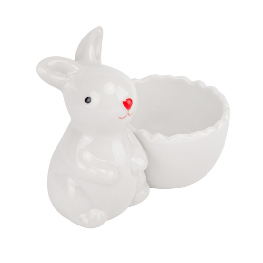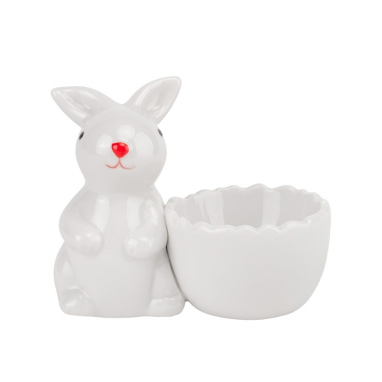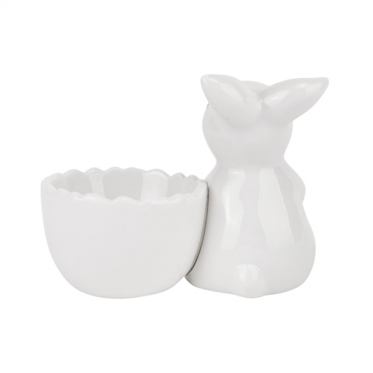 Эта стильная подставка для яйца сочетает в себе функциональность и декоративность. Белоснежная глянцевая керамика подчёркивает элегантность дизайна, а фигурка кролика с милой мордочкой добавляет изделию очарования. Чашечка для яйца выполнена в виде раскрытого цветка с рельефными краями, создавая эффект лёгкости и утончённости. Такая подставка идеально подходит для сервировки крашенок, шоколадных яиц или декорирования праздничного стола.