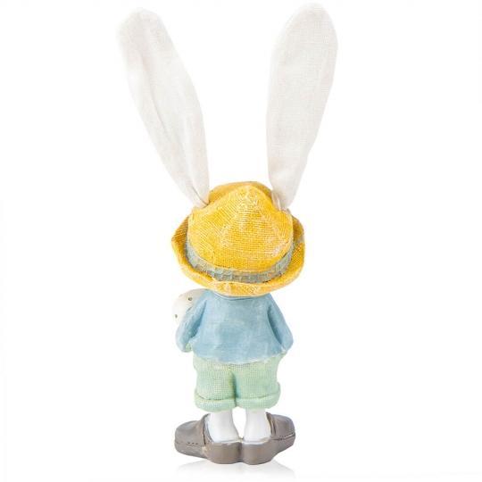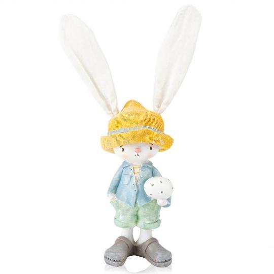 Пасхальный кролик выполнен из качественного материала – полистоуна, белого цвета в стильном наряде, держит в кавычках пасхальное яичко. Фигурка стойко стоит, ушки гнутся.