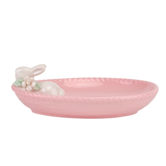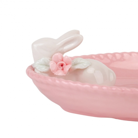Эта элегантная керамическая тарелка с белым кроликом станет изысканным украшением пасхального стола. Декоративный край и фигурка кролика с цветочным декором придают изделию особое очарование. Тарелка выполнена в нежном розовом оттенке, гармонично дополняя сервировку праздничных блюд. Подходит для подачи выпечки, десертов и других лакомств.