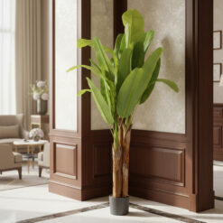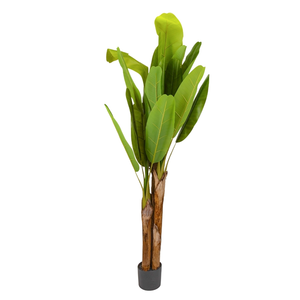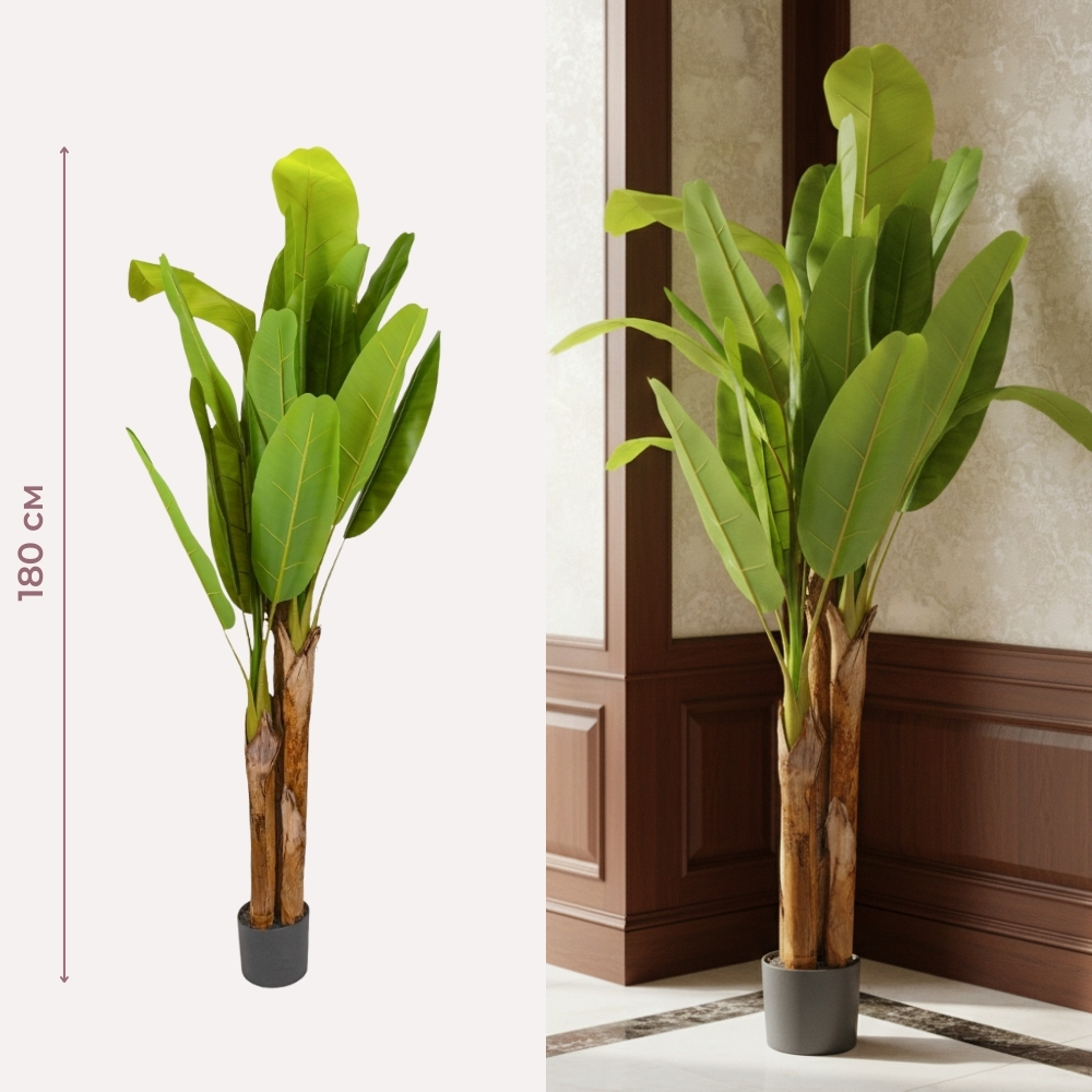 Висота – 180 см. Штучне бананове дерево в горщику висотою 180 см — масштабний інтер’єрний акцент для бізнесу, який створює ефектний екзотичний колорит та атмосферу преміального відпочинку без потреби у складному догляді. Широке реалістичне листя з характерною текстурою виглядає максимально натурально, формуючи соковитий зелений масив, який привертає увагу у вітрині, холі або зоні очікування. Бананова пальма ідеально підходить для HoReCa, стилізованих кафе, торгових центрів та креативних офісних просторів, додаючи інтер’єру об’єму та свіжості. Дерево встановлене у базовий горщик, що забезпечує стабільність та дозволяє легко інтегрувати його в керамічне або бетонне кашпо під ваш дизайн. Це надійне рішення для створення «зелених джунглів» у комерційних проєктах, яке гарантує бездоганну естетику без ризику в’янення листя.