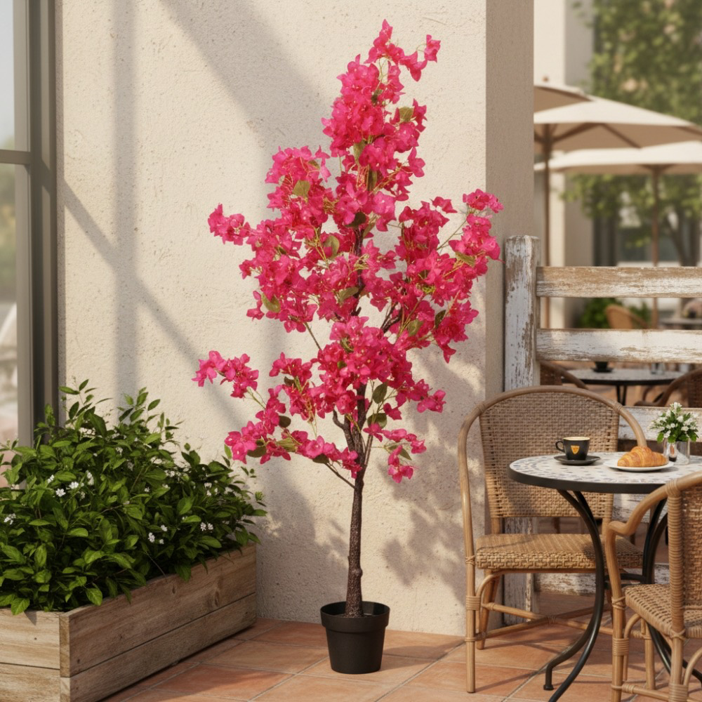 Висота – 180 см. Штучне дерево “Бугенвілія” в горщику висотою 180 см — яскравий та вишуканий інтер’єрний акцент для бізнесу, який створює сонячну атмосферу квітучого Середземномор’я без турбот про полив чи освітлення. Густе суцвіття насиченого кольору в поєднанні з реалістичним зеленим листям формує ефектний візуальний фокус, який притягує погляди відвідувачів у залі, на терасі або у вітрині. Бугенвілія ідеально підходить для HoReCa, весільних салонів, літніх майданчиків ресторанів та фотозон, додаючи простору романтичного настрою та святкового вигляду. Дерево встановлене у базовий горщик, що дозволяє легко інтегрувати його в декоративне кашпо або плетену скриню під стиль вашого інтер’єру. Це практичне рішення для масштабних декораторських проєктів, яке дозволяє вашому бізнесу «квітнути» цілий рік, незалежно від сезону.