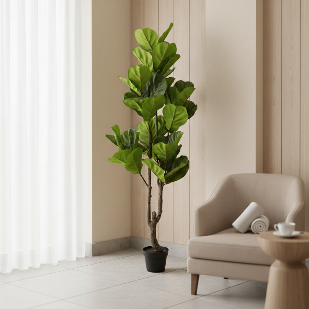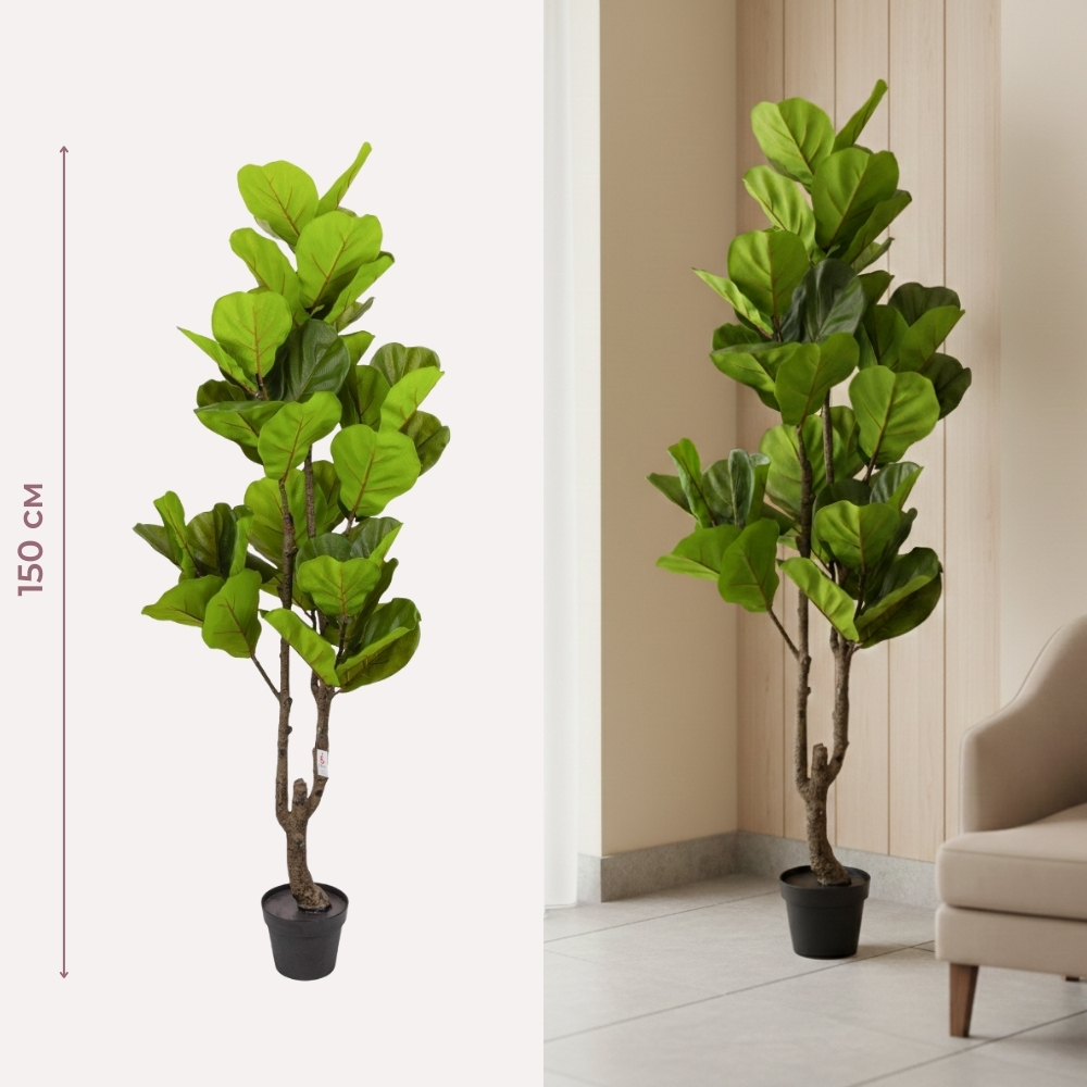 Висота – 150 см. Штучне дерево “Фікус ліроподібний” в горщику висотою 150 см — один із найтрендовіших інтер’єрних акцентів для бізнесу, який миттєво додає простору сучасної естетики та преміального стилю без витрат на догляд. Велике, широке листя з характерною формою «скрипки» та реалістичним рельєфом прожилок виглядає надзвичайно натурально, створюючи виразний графічний силует у будь-якому куточку залу чи офісу. Фікус лірата ідеально підходить для HoReCa, концепт-сторів, шоурумів та сучасних апартаментів, гармонійно вписуючись у стилі скандинавський мінімалізм, лофт або мід-сенчурі. Дерево встановлене у базовий горщик, що дозволяє легко змінити його зовнішній вигляд, підібравши дизайнерське кашпо під ваш інтер’єр. Це надійне та стильне рішення для професійного декорування, яке забезпечує актуальний і дорогий вигляд вашого простору цілий рік.