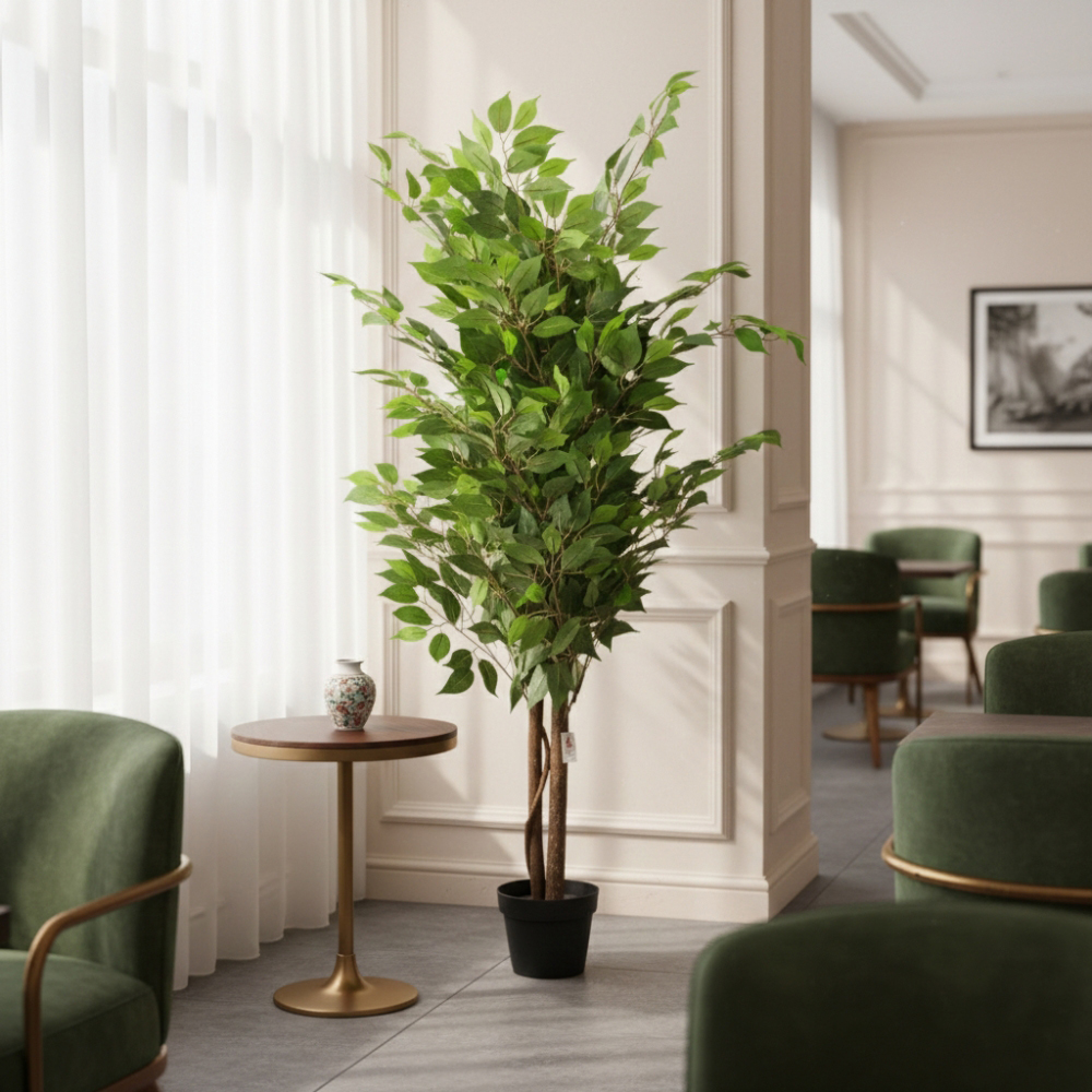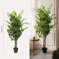Висота – 140 см. Штучне дерево “Фікус” в горщику висотою 140 см — класичний та елегантний інтер’єрний акцент для бізнесу, який миттєво додає простору статусності та затишку без необхідності щоденного догляду. Густа крона з реалістичним глянцевим листям і деталізованим стовбуром створює природний візуальний об’єм, що ідеально підходить для заповнення порожніх зон, оформлення холів або робочих кабінетів. Фікус є універсальним вибором для HoReCa, бізнес-центрів, банківських установ та медичних клінік, де важливо підтримувати професійний та презентабельний вигляд інтер’єру. Дерево встановлене у базовий горщик, що дозволяє легко інтегрувати його в декоративне кашпо, яке відповідає вашій корпоративній естетиці. Це практичне та довговічне рішення для мережевих проєктів, яке зберігає насичений колір і форму листя протягом усього терміну експлуатації.