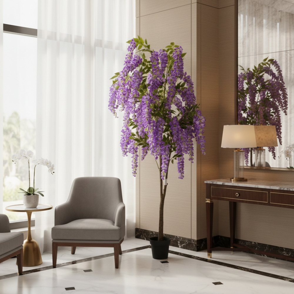 Висота – 200 см. Штучне дерево “Гліцинія бузкова” в горщику висотою 200 см — ефектний інтер’єрний акцент для оформлення просторих залів, ресторанів, готелів, салонів краси, шоурумів та торгових площ. Висока реалістична крона з каскадними бузковими суцвіттями створює відчуття живої рослини та додає простору легкості й статусності без витрат на догляд. Завдяки висоті 200 см дерево працює як самостійний декоративний елемент для фотозон, вітрин та зонування приміщень. Міцний стовбур і базовий горщик забезпечують стабільність та зручність встановлення у кашпо або декоративні контейнери. Ідеальне рішення для B2B-клієнтів, які шукають довговічний, презентабельний декор для постійного використання.