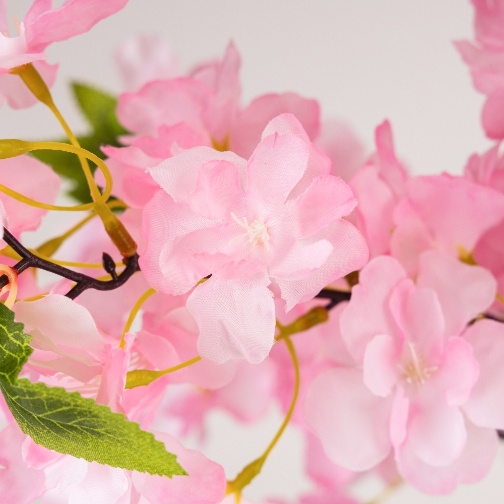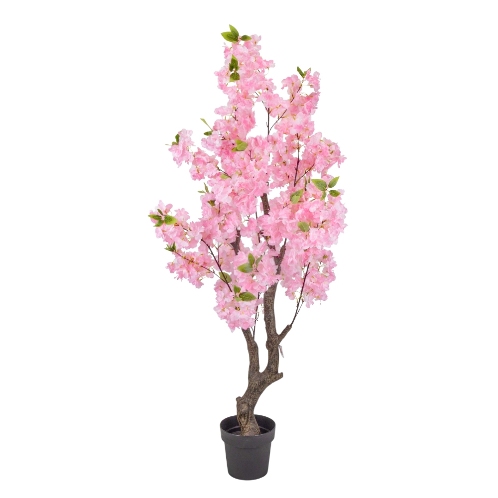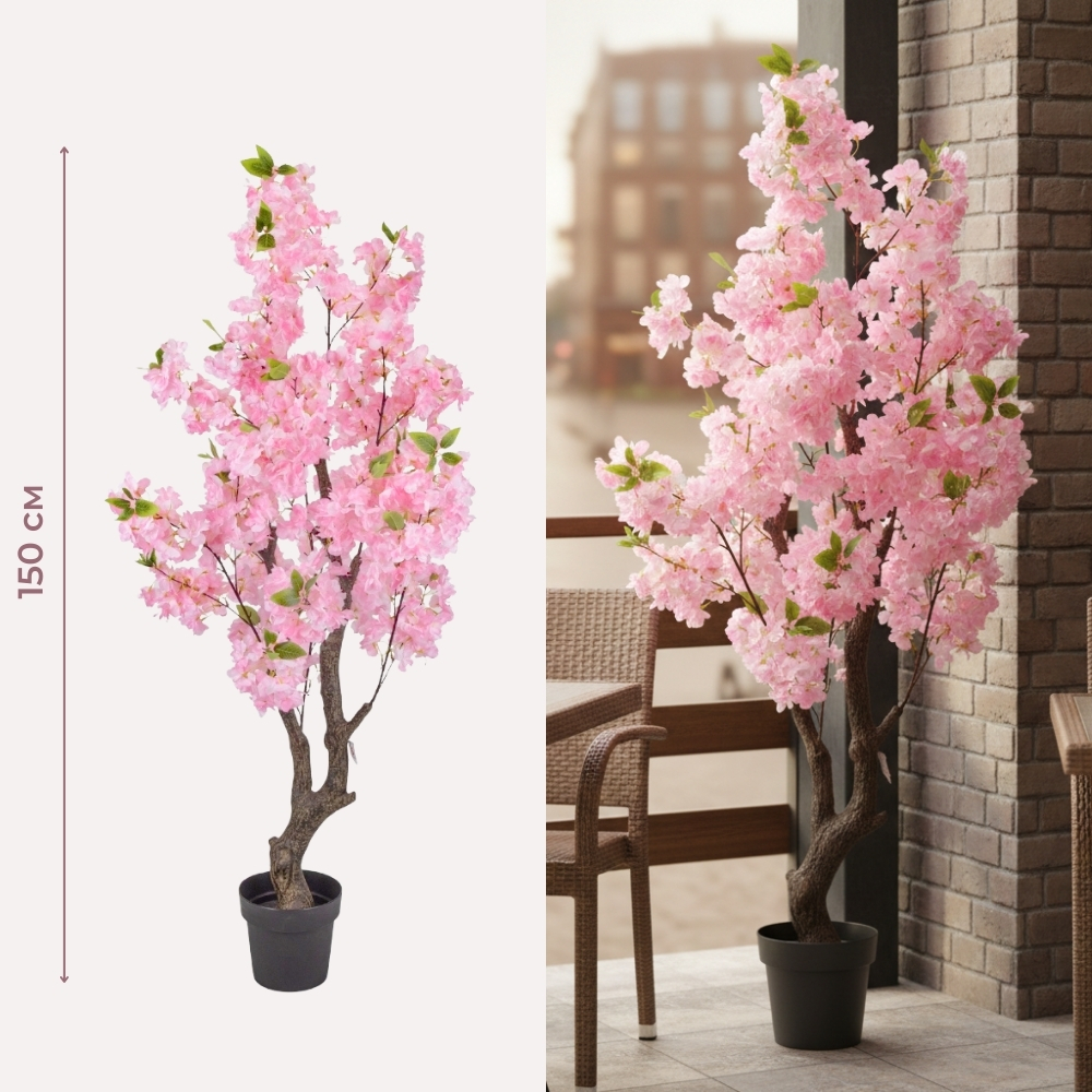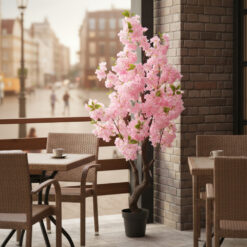 Висота – 150 см. Штучне дерево “Сакура” в горщику висотою 150 см — вишуканий та романтичний інтер’єрний акцент для бізнесу, який миттєво додає простору ніжності, легкості та весняного настрою без необхідності щоденного догляду. Пишна крона з реалістичними ніжно-рожевими квітами та деталізованим стовбуром створює яскравий візуальний об’єм, що ідеально підходить для створення фотозон, оформлення вхідних груп або зонування простору. Сакура є ідеальним вибором для HoReCa, салонів краси, весільних шоурумів та тематичних ресторанів, де важливо створити особливу естетичну атмосферу та привернути увагу клієнтів. Дерево встановлене у базовий горщик, що дозволяє легко інтегрувати його в декоративне кашпо, яке відповідає стилістиці вашого інтер’єру. Це практичне та довговічне рішення для святкового або постійного декору, яке зберігає свою свіжість та квітучий вигляд незалежно від пори року.