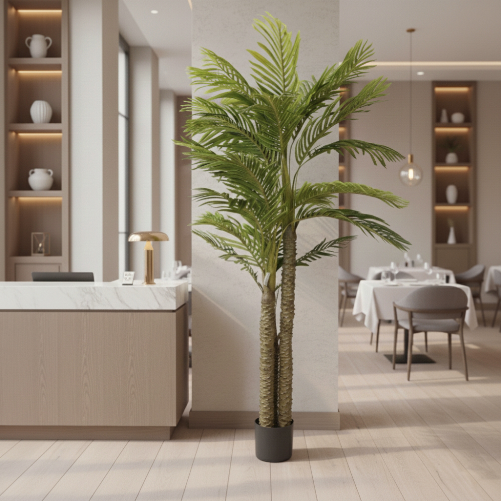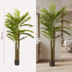 Висота – 180 см. Штучне пальмове дерево в горщику висотою 180 см — ефектний інтер’єрний акцент для бізнесу, який миттєво створює атмосферу тропічного затишку та преміального комфорту без витрат на професійний догляд. Пишне реалістичне листя з деталізованою текстурою формує виразний об’єм та стає ідеальним візуальним фокусом у просторих залах, лаунж-зонах або біля вхідних груп. Пальма є універсальним рішенням для HoReCa, аквапарків, фітнес-центрів, фотостудій та великих офісів, де важливо підкреслити масштаб і статусність об’єкта. Дерево встановлене у базовий горщик, що дозволяє легко змінити його зовнішній вигляд, обравши дизайнерське кашпо під стиль вашого інтер’єру. Це практичне та довговічне рішення для комерційних проєктів, яке зберігає насичений зелений колір і презентабельний вигляд протягом багатьох років.