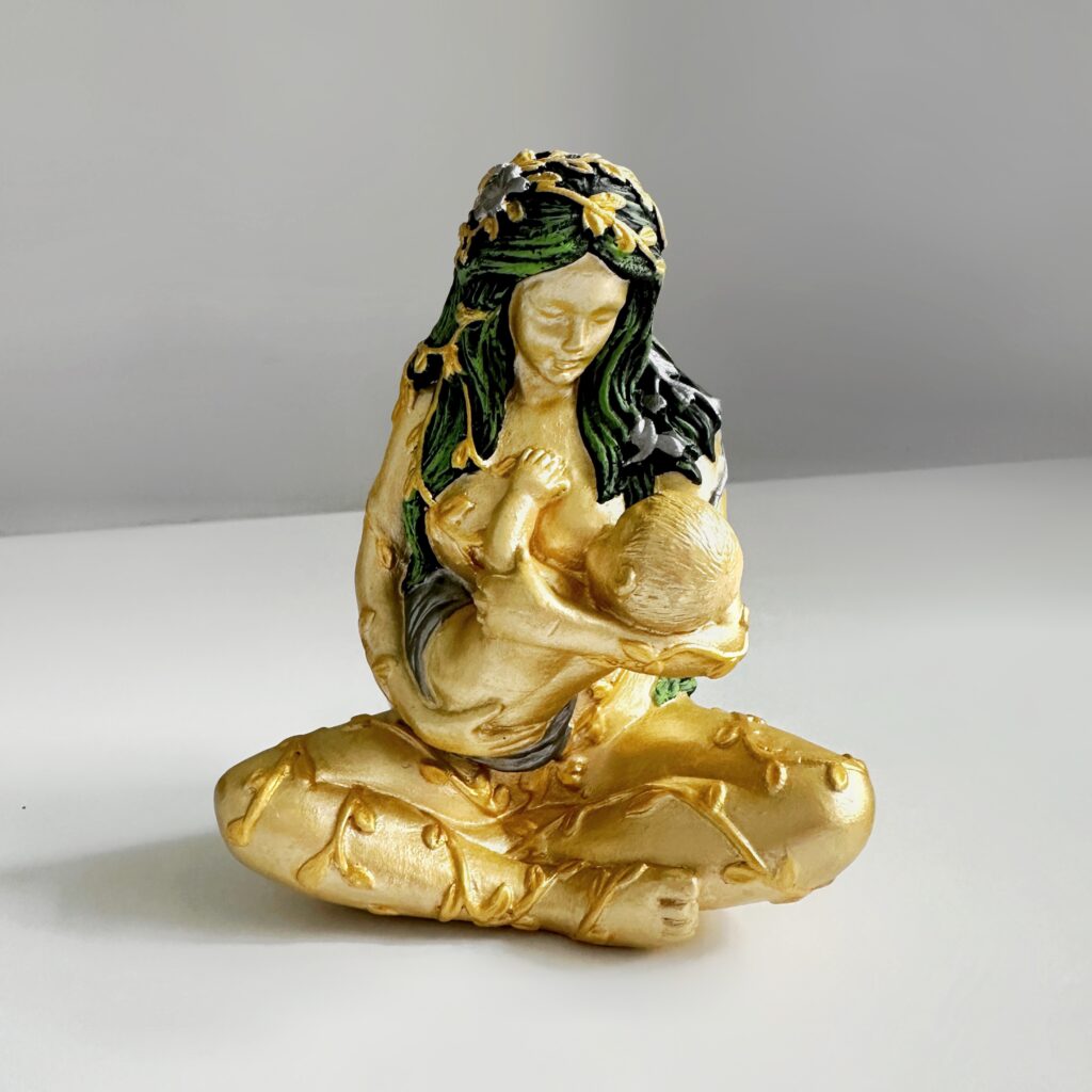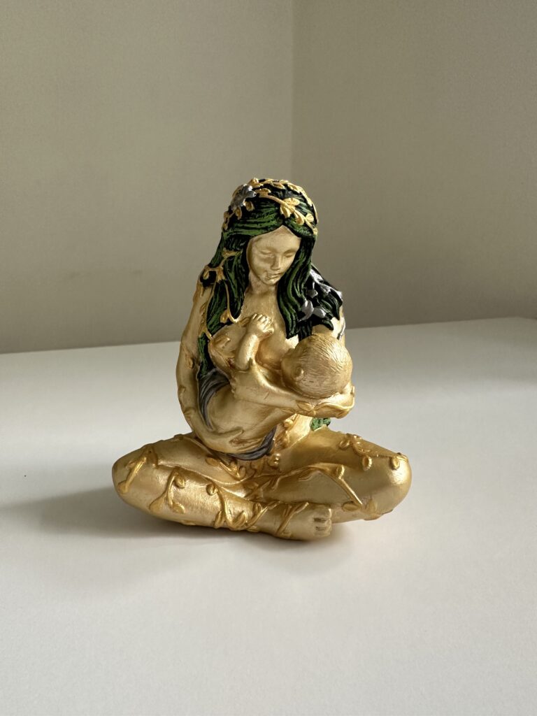 Ця витончена гіпсова статуетка зображує Гайю — богиню Землі та Мати всього живого — в образі жінки, що ніжно годує немовля. Символічний акт материнства підкреслює глибинний зв’язок людини з природою, життям та Всесвітом. Тіло статуетки вручну пофарбоване у благородний відтінок рожевого золота, з декоративними елементами у вигляді золотих пагонів, що обвивають фігуру, нагадуючи про єдність з природою.