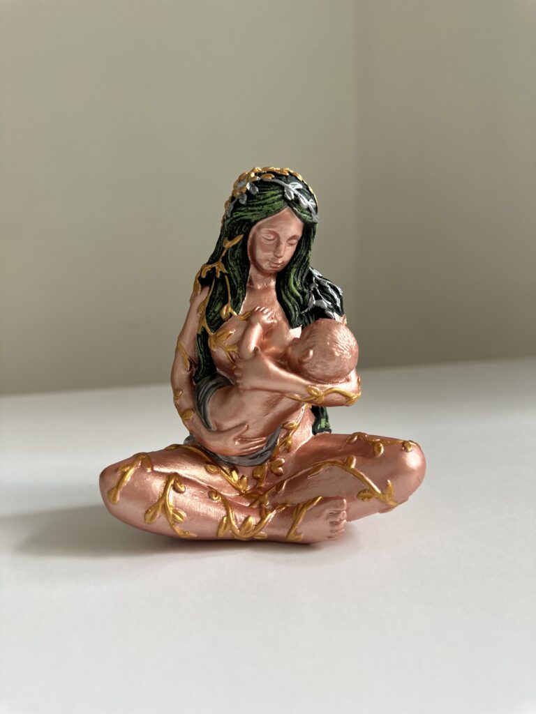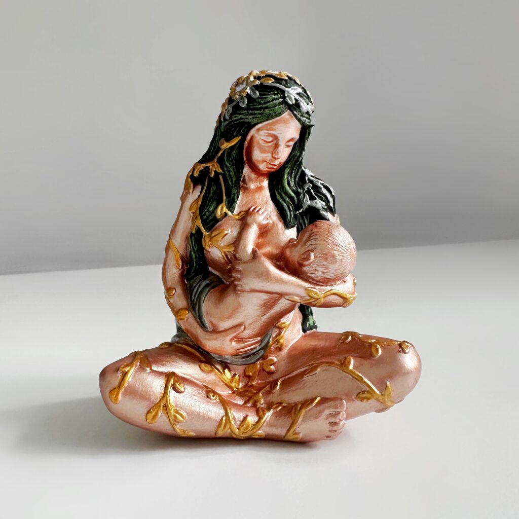 Ця витончена гіпсова статуетка зображує Гайю — богиню Землі та Мати всього живого — в образі жінки, що ніжно годує немовля. Символічний акт материнства підкреслює глибинний зв’язок людини з природою, життям та Всесвітом. Тіло статуетки вручну пофарбоване у благородний відтінок рожевого золота, з декоративними елементами у вигляді золотих пагонів, що обвивають фігуру, нагадуючи про єдність з природою.