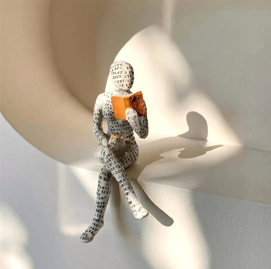 Статуетка “Мудрість читання” із серії надихаючих образів передає ідею спокою та гармонії, знайдених у процесі читання. Елегантний силует людини, захопленої книгою, доповнюється милим котиком, що зручно вмостився на колінах, створюючи атмосферу тепла й затишку. Унікальний дизайн із текстовим принтом робить статуетку стильним акцентом у вашому інтер’єрі. Виконана з високоякісних матеріалів, ця статуетка підкреслить вашу любов до читання і стане чудовим подарунком для книголюбів.