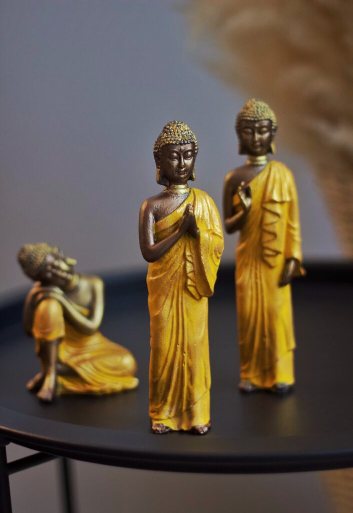 Ця статуетка Будди виготовлена з гіпсу з ручним розписом, що робить кожен виріб унікальним. Благородні золотисто-бронзові відтінки надають їй вишуканості та підкреслюють східний стиль. Будда в позі Анжалі Мудра виражає подяку та щирість, а також допомагає зосередитися на духовних практиках. Чудовий вибір для дому, робочого простору, йога-студії або зони медитації.