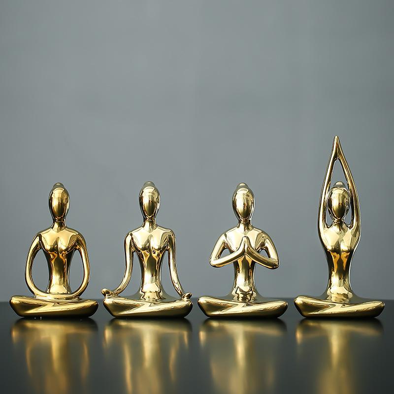 До набору входять чотири статуетки, кожна з яких зображає людину в одній із класичних поз йоги: