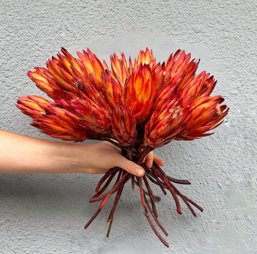 Протея – ефектна декоративна квітка, яка додає екзотики та глибини будь-яким флористичним роботам. Її насичений червоний відтінок із плавними переходами до бордового й помаранчевого створює відчуття вогню й динаміки в інтер’єрі.