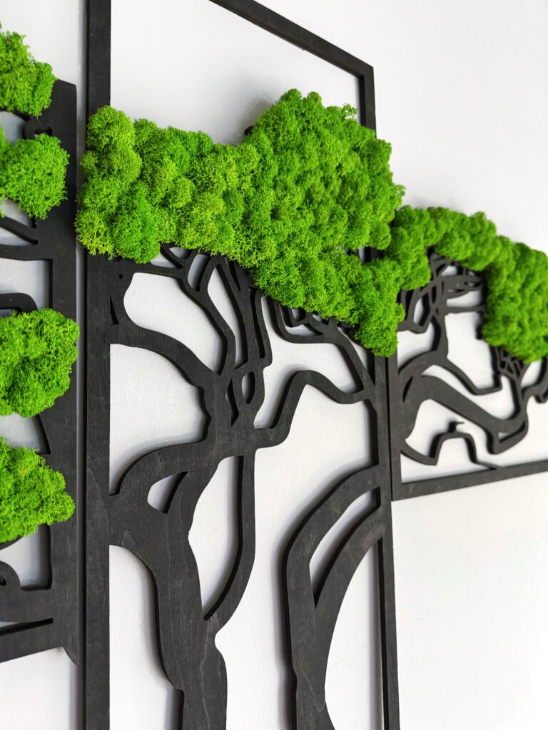 Триптих зі стабілізованим мохом “Бонсай” — це унікальна прикраса, яка додасть природної гармонії у ваш інтер’єр. Виготовлений із якісного стабілізованого моху та фанери, він не потребує догляду та зберігає свій насичений зелений колір протягом багатьох років. Сучасний дизайн у вигляді дерева “Бонсай” символізує красу природи та спокій. Це ідеальний вибір для оформлення дому, офісу, кафе чи студії. Також можливе виготовлення панно в індивідуальних розмірах для вашого проєкту.