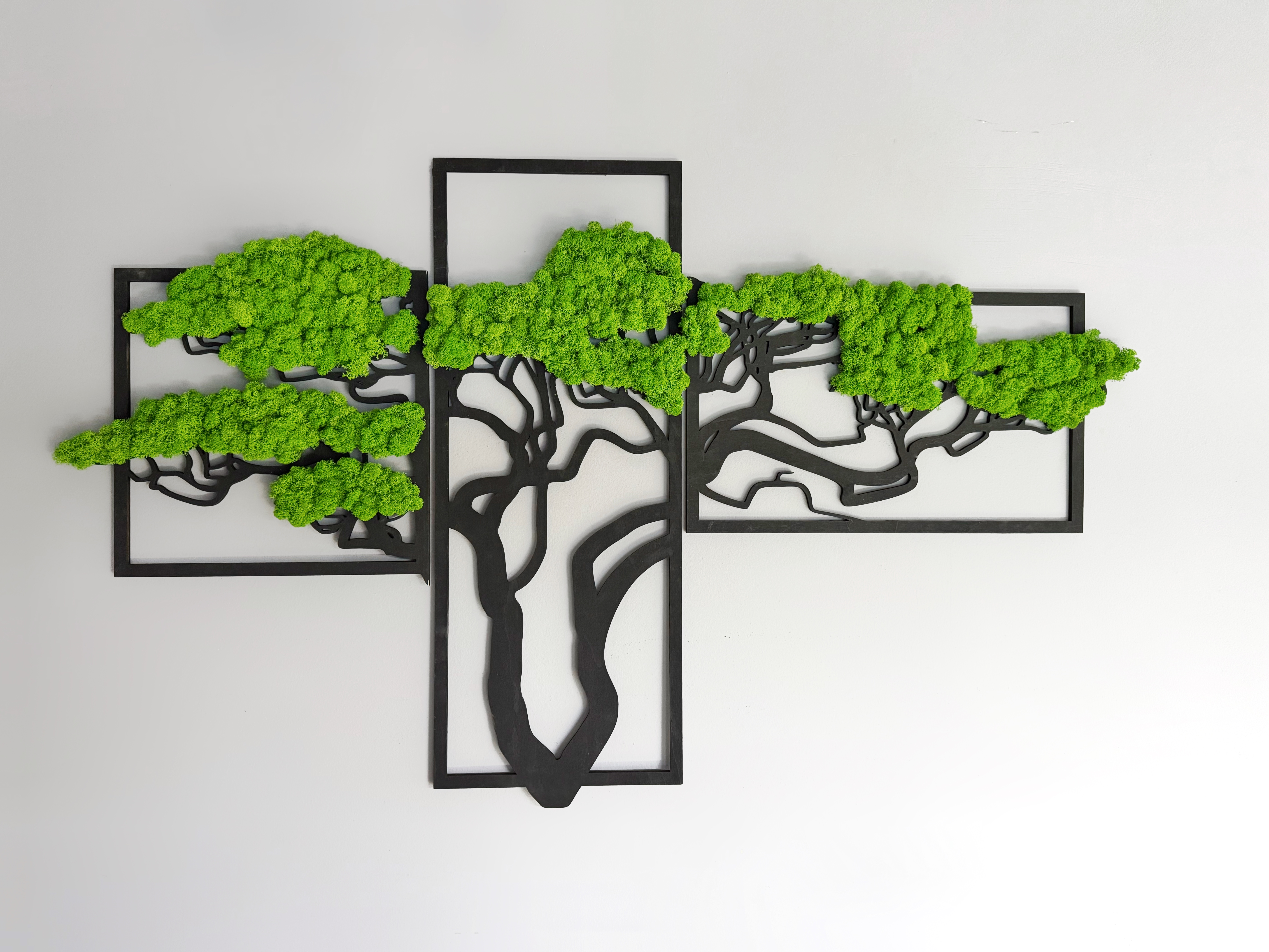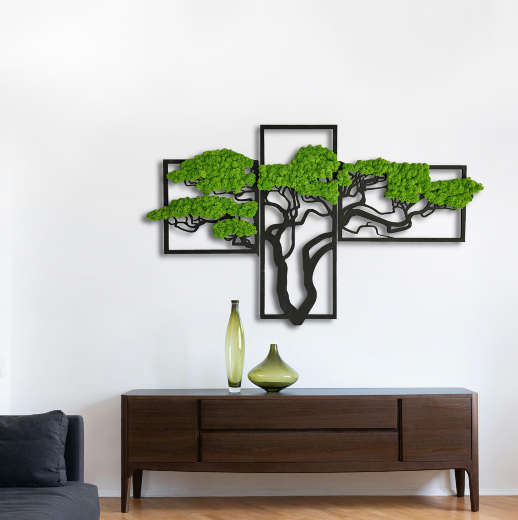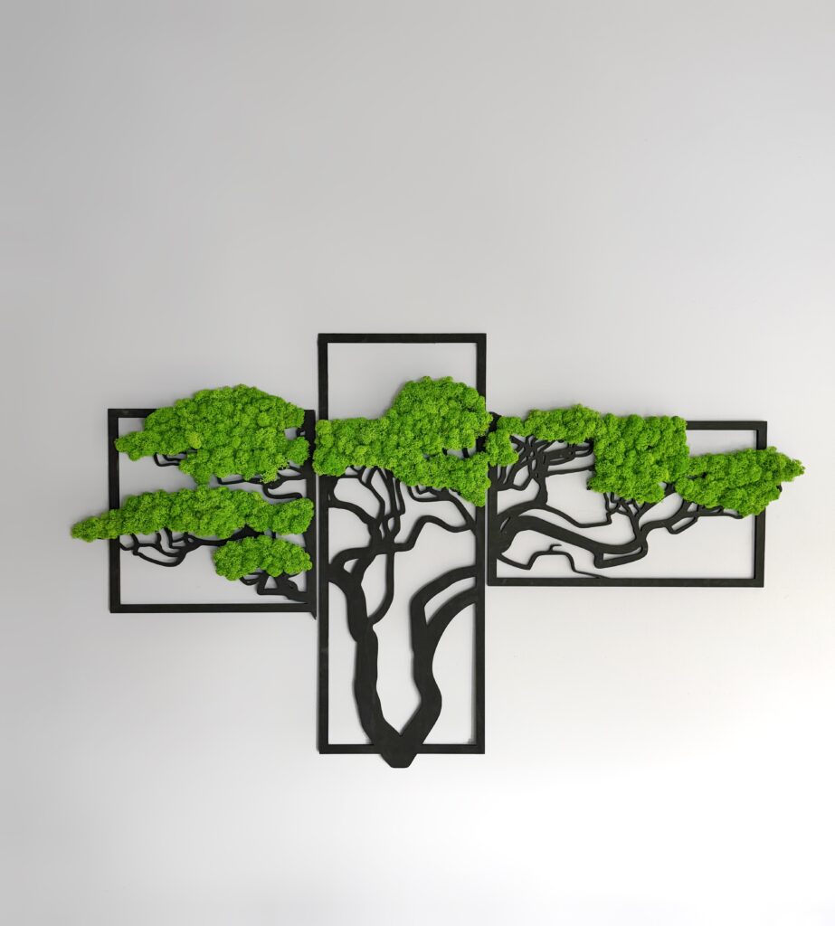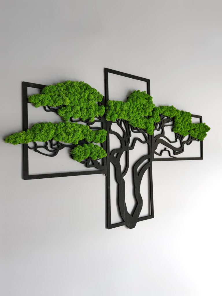 Триптих зі стабілізованим мохом “Бонсай” — це унікальна прикраса, яка додасть природної гармонії у ваш інтер’єр. Виготовлений із якісного стабілізованого моху та фанери, він не потребує догляду та зберігає свій насичений зелений колір протягом багатьох років. Сучасний дизайн у вигляді дерева “Бонсай” символізує красу природи та спокій. Це ідеальний вибір для оформлення дому, офісу, кафе чи студії. Також можливе виготовлення панно в індивідуальних розмірах для вашого проєкту.