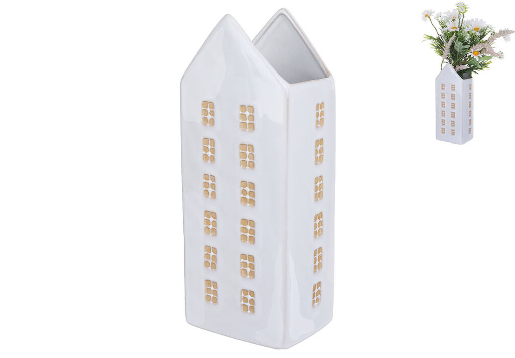 Ваза-кашпо у формі витягнутого білого будиночка — це стильний і функціональний елемент декору для вашого дому. Білосніжна кераміка й глянцева поверхня роблять її ідеальною для сучасного або скандинавського інтер’єру. Підходить як для сухоцвітів, так і як декоративне кашпо для штучних рослин. Такий виріб стане запам’ятовуваним акцентом на полиці, каміні чи підвіконні.