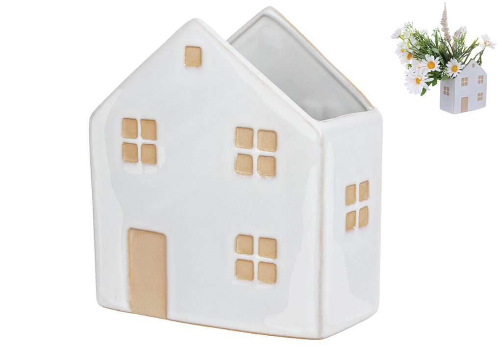 Незвичайна ваза у формі милого білого будиночка виготовлена з якісної кераміки з гладким глянцевим покриттям. Вона стане стильним акцентом у сучасному або скандинавському інтер’єрі, пасуватиме для декору полиці, столу або підвіконня. Використовуйте її для сухоцвітів, гілочок або як самостійний елемент декору. Чудовий подарунок для поціновувачів затишку й креативних рішень в оздобленні дому.