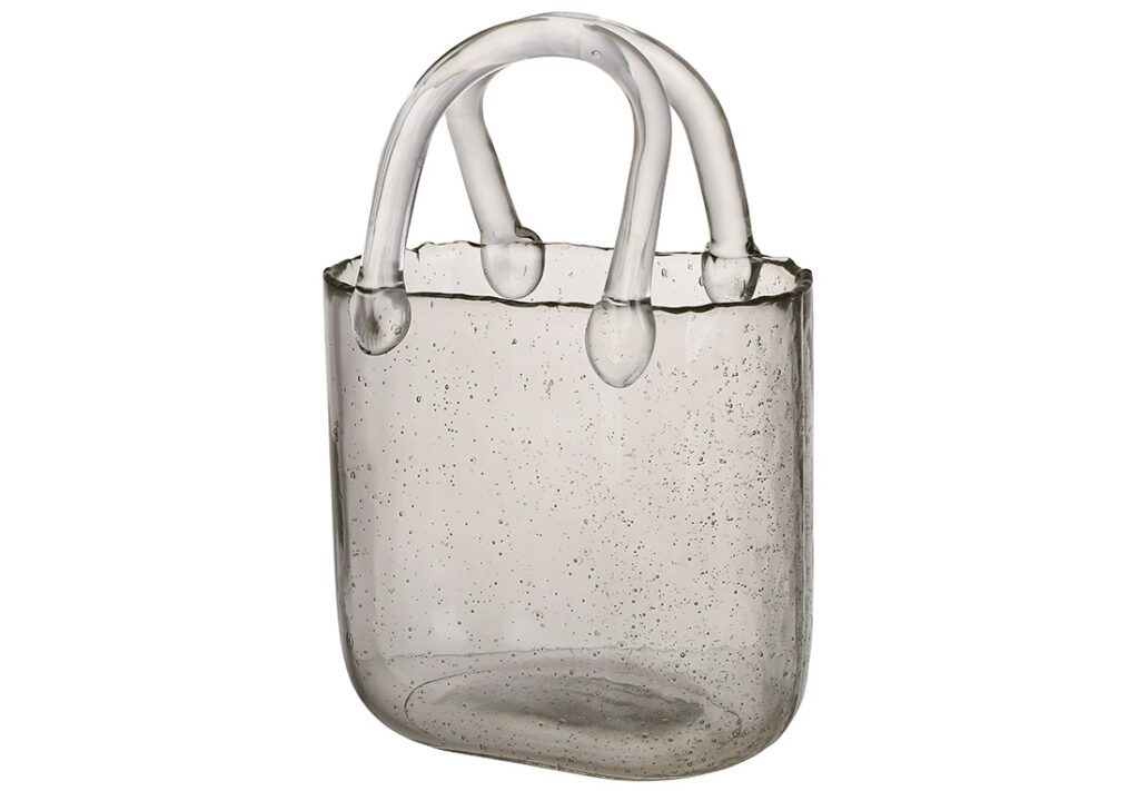 Виріб виконаний із димчасто-сірого скла з легким ефектом бульбашок, що додає фактурності та сучасного характеру. Незвична форма з ручками імітує жіночу сумочку, роблячи вазу виразним акцентом у будь-якому інтер’єрі.