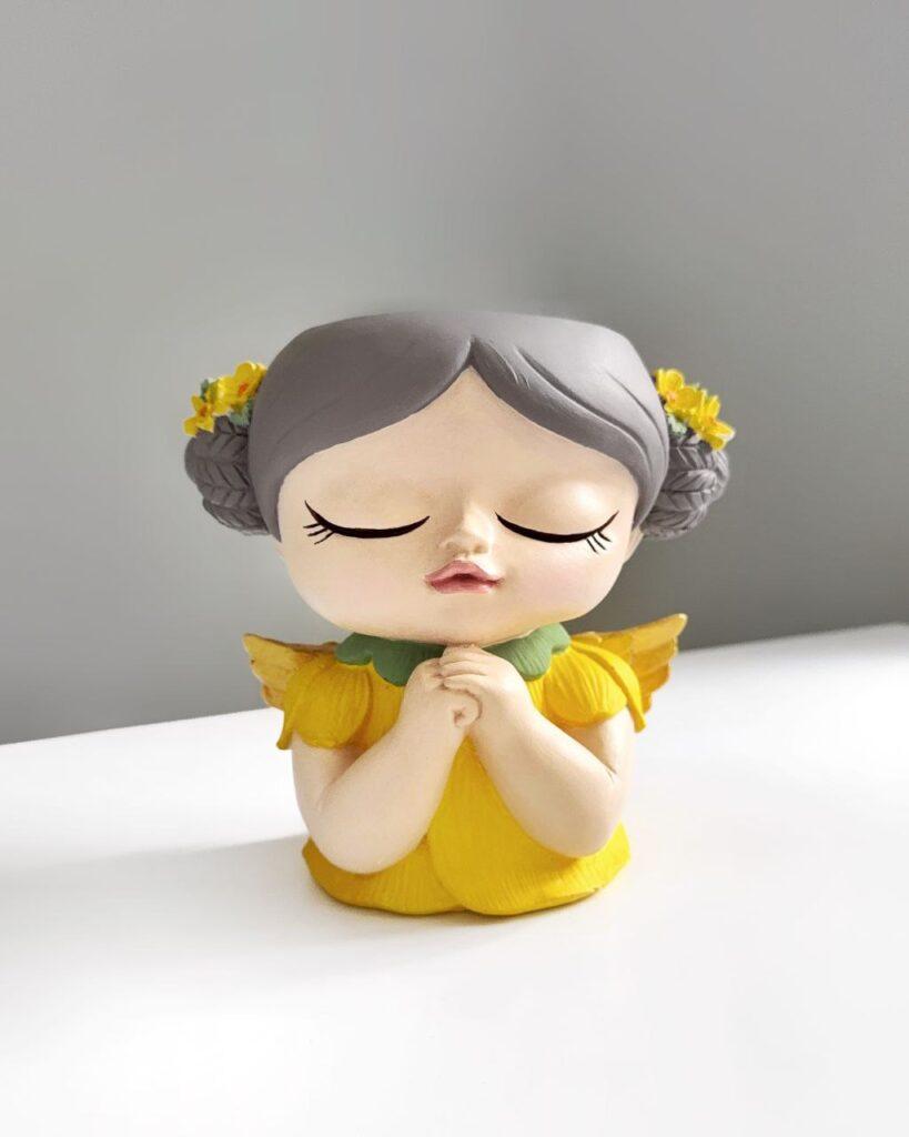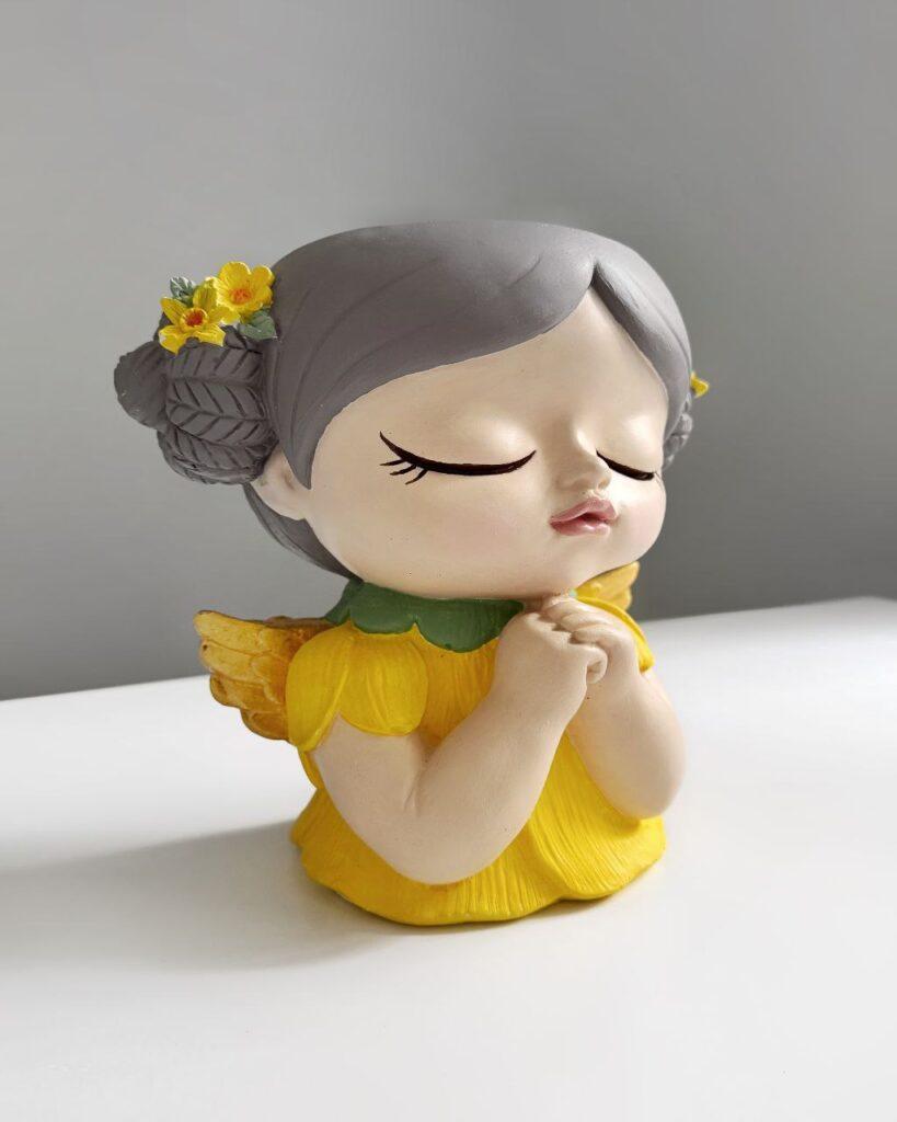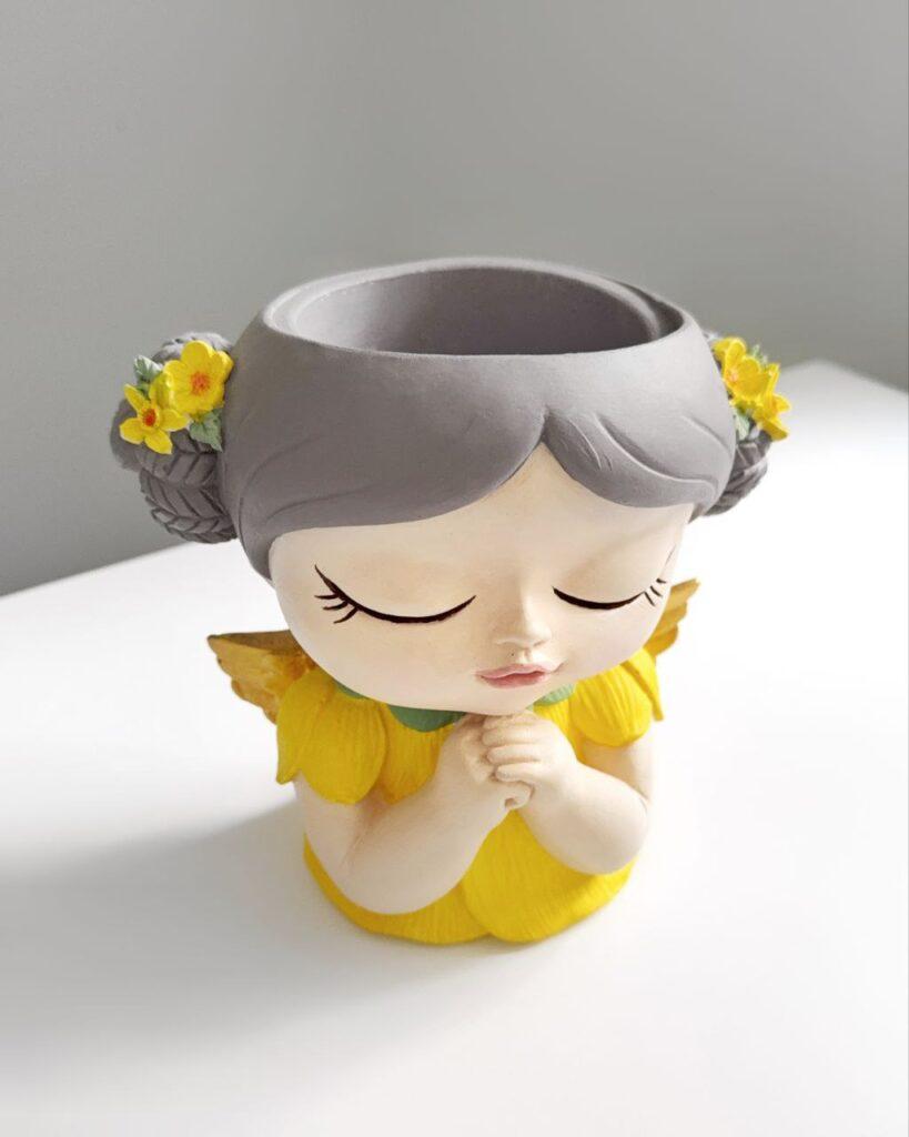 Елегантне велике кашпо у вигляді жовтої феї, виконане вручну з гіпсу. Яскравий жовтий колір та детальний ручний розпис створюють атмосферу тепла та казковості. Кашпо стане чудовою прикрасою для вітальні, спальні або дитячої кімнати. Воно підкреслить ваш індивідуальний стиль та додасть затишку в будь-який інтер’єр. Ідеально підходить для оформлення інтер’єру або як оригінальний подарунок.