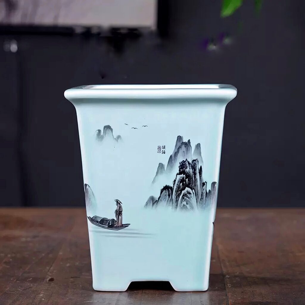 Горщик для бонсай – це втілення східної філософії у вишуканій формі. Світло-блакитна кераміка прикрашена тонким живописом із гірським пейзажем і фігурою в кімоно. Такий аксесуар не тільки прикрасить ваш інтер’єр, а й стане справжнім витвором мистецтва.