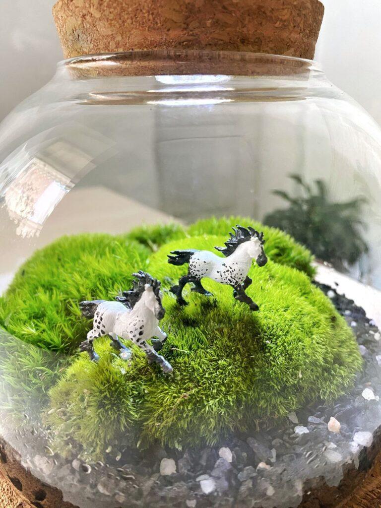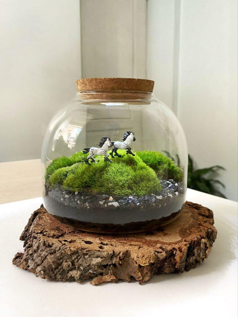 Живий мох у банці з підсвіткою та фігурками коней – це чарівна та стильна композиція, яка додасть унікальності вашому інтер’єру. Розмір композиції становить 15х14 см, а вбудована підсвітка створює казкову атмосферу. Всередині банки на моху, наче на полі, скачуть дві фігурки коней, надаючи композиції динамічності та оригінальності. Догляд за композицією простий: достатньо обприскувати мох один раз на тиждень. За вашим бажанням, ми можемо створити таку ж композицію зі стабілізованим мохом, який не потребує догляду.